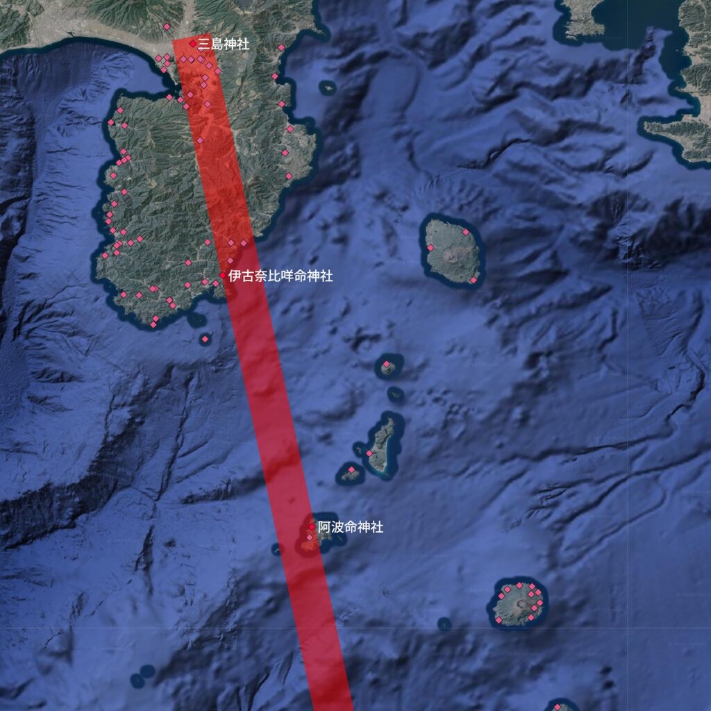 これらの式内社を結ぶと、大社から伊豆半島・伊豆諸島を貫く軸のようなものを見出すことができる[3]。