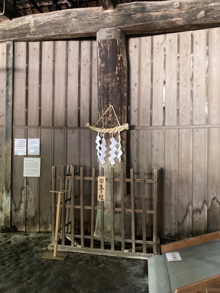台所の土間空間には、大地に根を張り立ち上がる「生き柱」が存在し、そこには注連縄が張られていた。