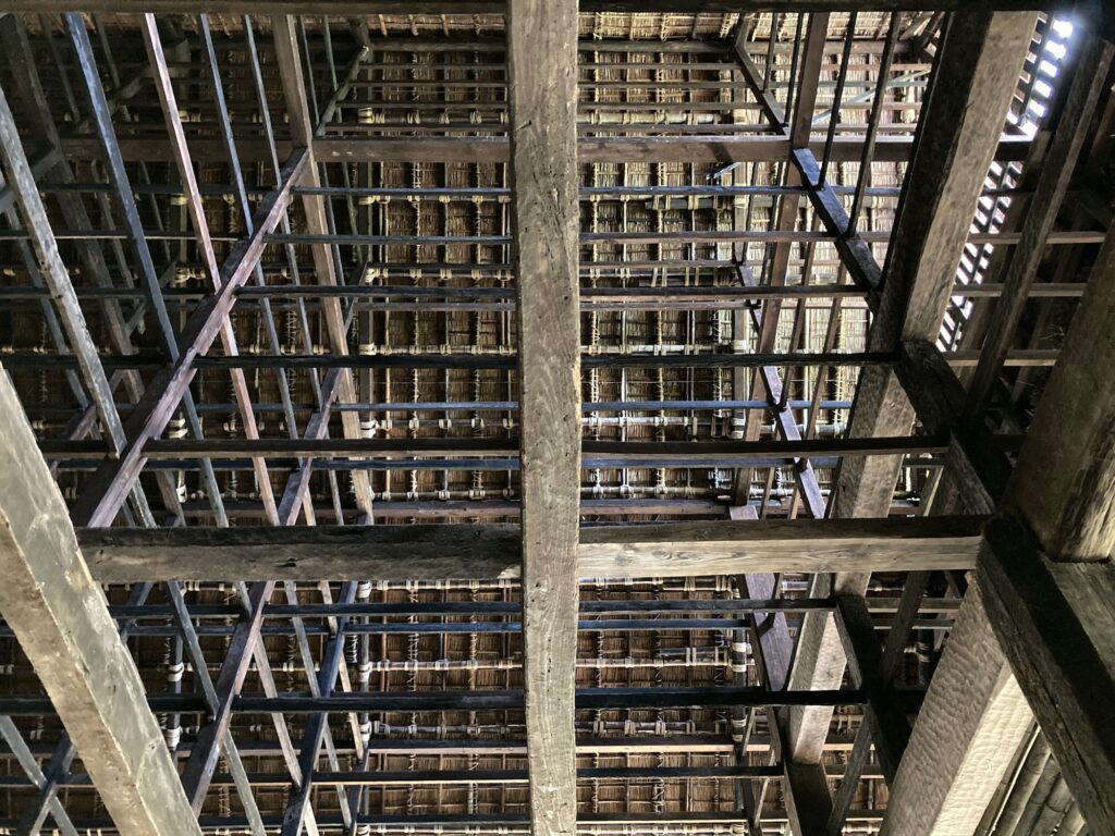 一方でそれより上方に載せられた小屋組みは、細い線材で構成された非常に端正で規則的なものであった。