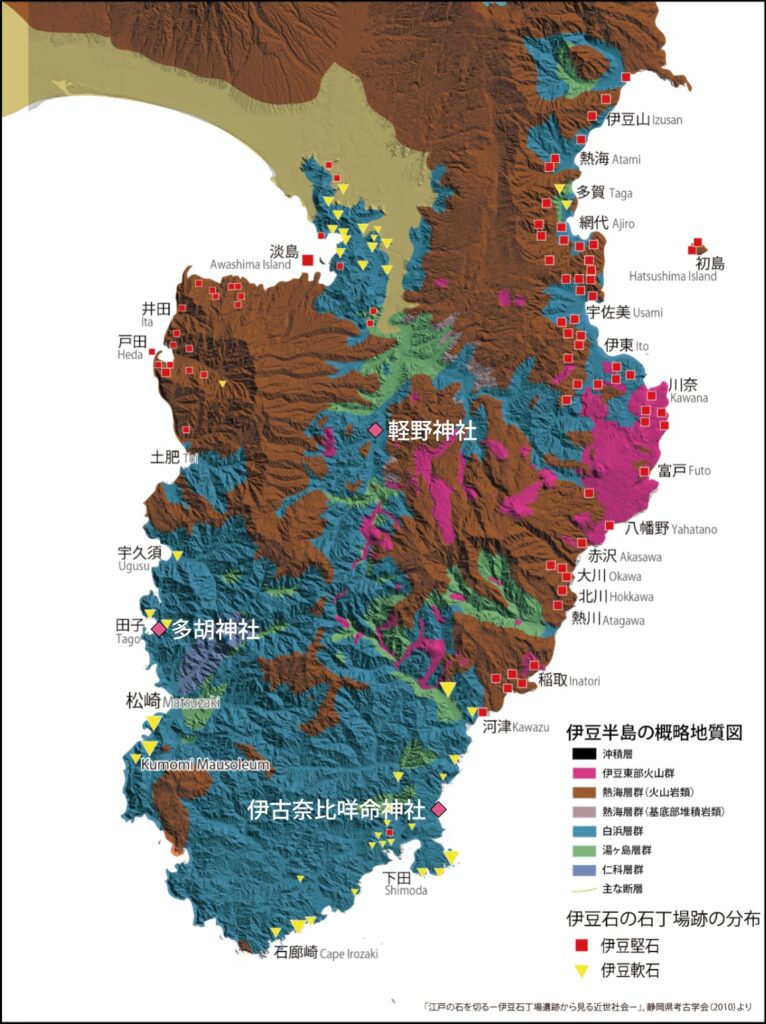 伊豆は江戸時代より石材の山地であったが、産地の地質により、火成岩質の「堅石」と、堆積岩質の「軟石」に分かれている。