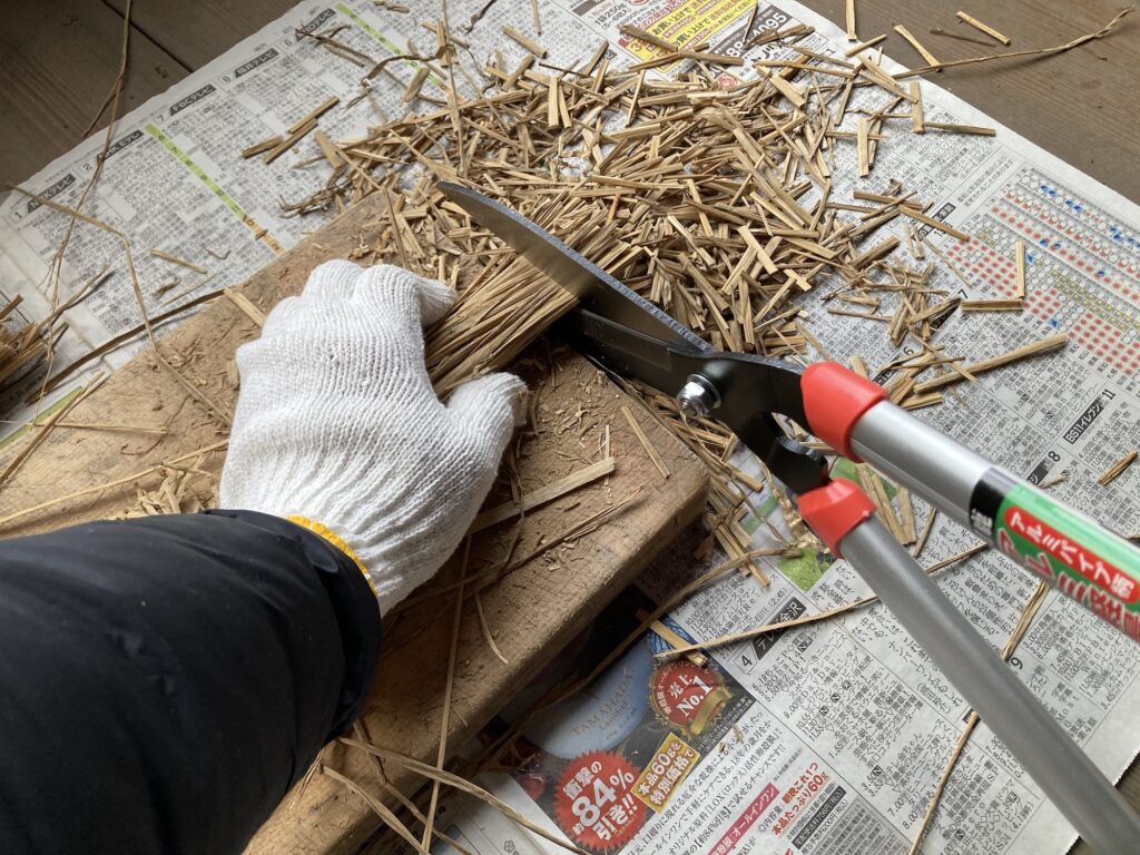 「藁切」という機械を買えば早いのですが、1万円以上してしまうので、枝切りハサミを使用しました。