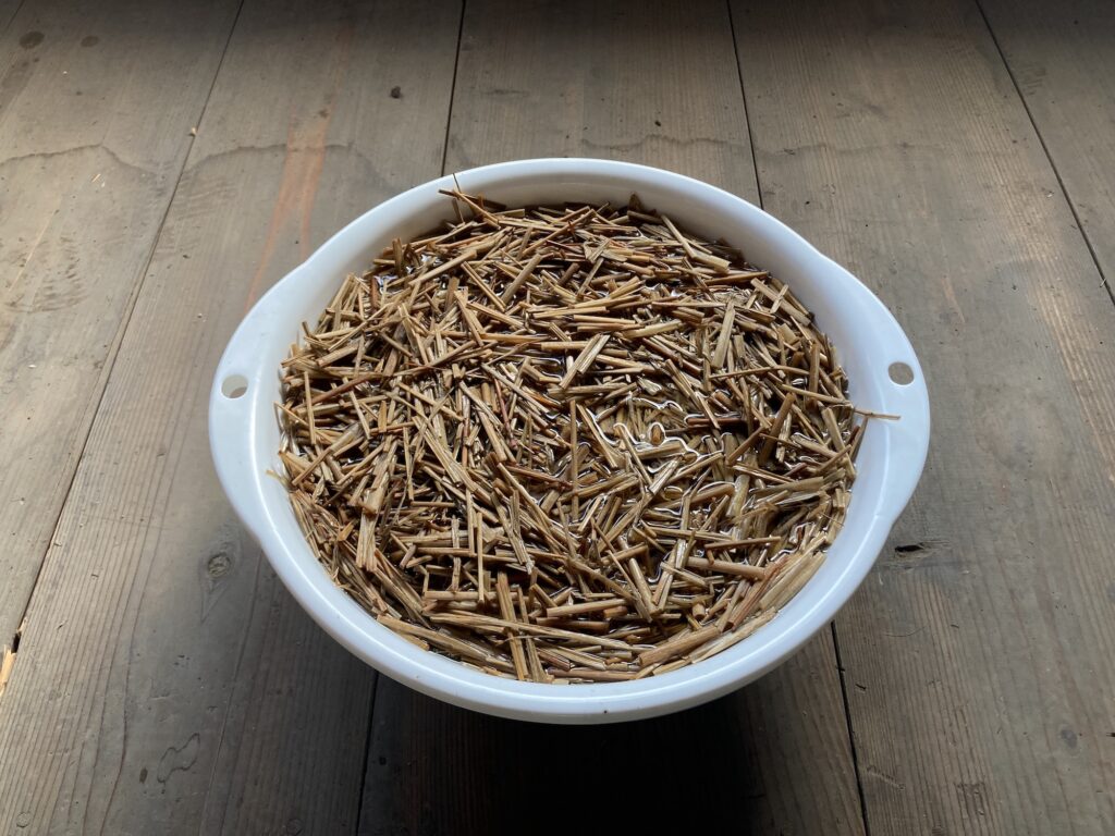 その後、ボウルにワラを入れ、水に漬けます。