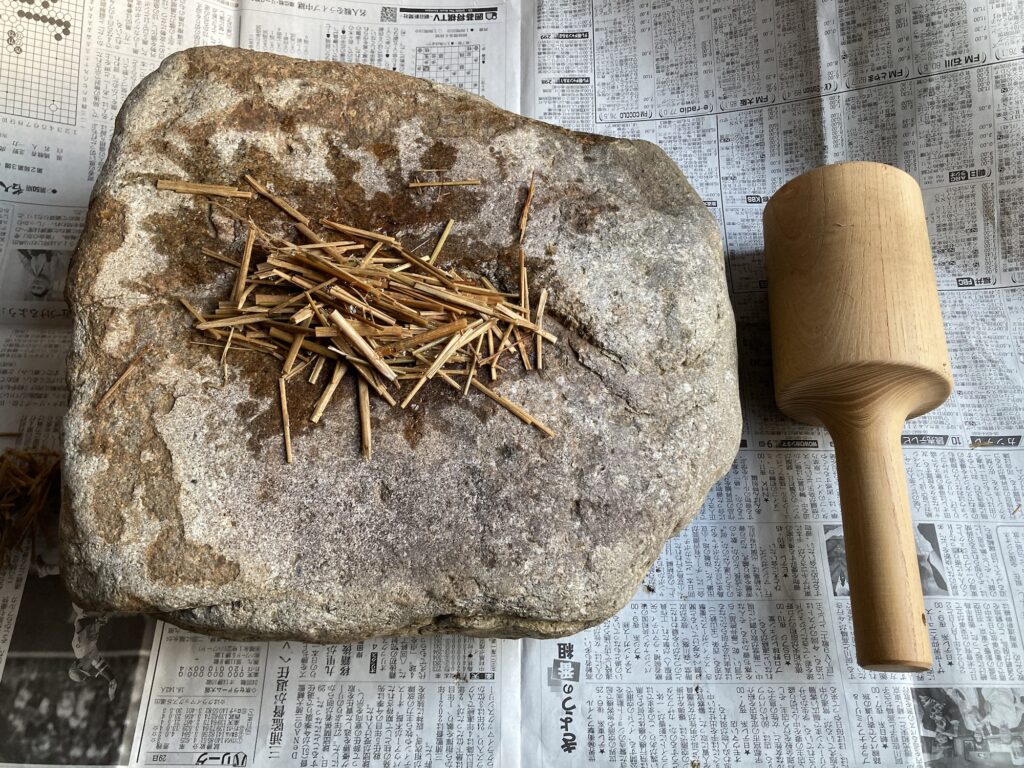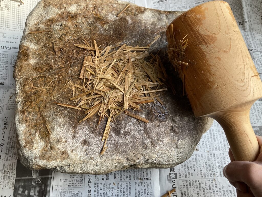 吸水したワラをひとつかみ掴んで石の上に置き、「ワラ槌」という道具を使って叩きほぐしていきます。
